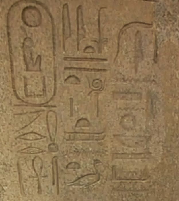 Ordenó buscar todas las imágenes de los antiguos dioses y destruirlas, especialmente las del rey de todos los reyes Amón-Ra. Si te fijas, la inscripción a la derecha está casi borrada: esta roca estaba encima de un obelisco de 27 metros de altura. Hasta allá tuvieron que subir los hombres de Akenatón a borrar el nombre de Amón-Ra.