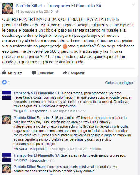 "Quiero poner una queja porque el día de hoy, a las 8:30 horas le pregunté al chofer del 67 si podía pagarle el pasaje a alguien y el me dijo que sí, le pagué el pasaje a un chico, él pasó su tarjeta y yo le di $10", contó la mujer en Facebook, buscando una respuesta por parte de la empresa de colectivos El Plumerillo S.A.