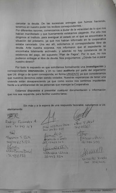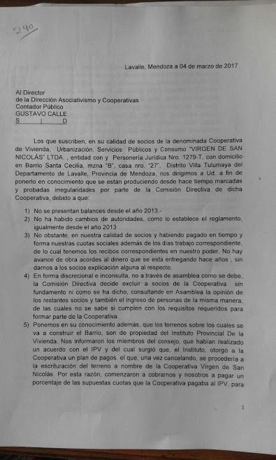 "La nueva comisión tiene que regularizar la situación y ponerse al día con los trámites y la documentación correspondiente. La cooperativa está inscripta desde el 2004 pero ha presentado numerosas irregularidades. Además de la denuncia que presentaron ante la Dirección de Cooperativas, los miembros presentaron denuncias judiciales. Tengo entendido que son 15,16 denuncias contra la comisión anterior presentadas ante la fiscalía de Delitos Económicos. Nosotros lo único que podemos hacer es orientarlos para que regularicen su situación con nosotros y con el IPV", agregó Calle.