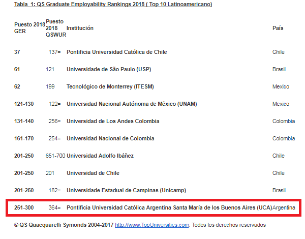 Además, de ese ranking se pueden obtener el Top 10 de Latinoamérica, liderado por Chile y en donde figura la Pontificia Universidad Católica de Buenos Aires como única institución argentina, en el puesto número 10.