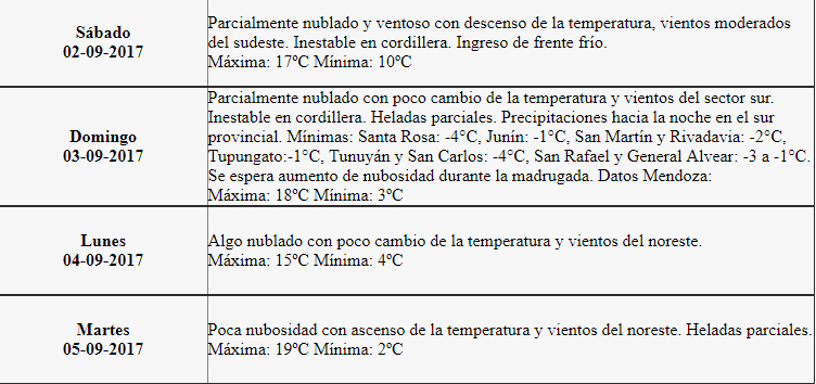 Hay que estar atentos: en las próximas horas podrían registrarse heladas en distintas zonas de la provincia, lo que significa un alerta para quienes campos con cultivos. Según el pronóstico de Contingencias Climática, se trata de heladas parciales, con precipitaciones en el sur provincial, que alcanzarían los 4 grados bajo cero en Santa Rosa, Tunuyán y San Carlos; 3 grados bajo en San Rafael y General Alvear, y hasta 2 grados bajo cero en los departamentos del Este.