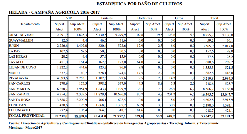 En el último año, del total de los campos destinados al cultivo de la vida de la provincia, el 15.3% resultó afectada por las heladas, según se desprende de un informe de Contingencias Climáticas, que analiza caso por caso, según cultivos y departamentos de la provincia: