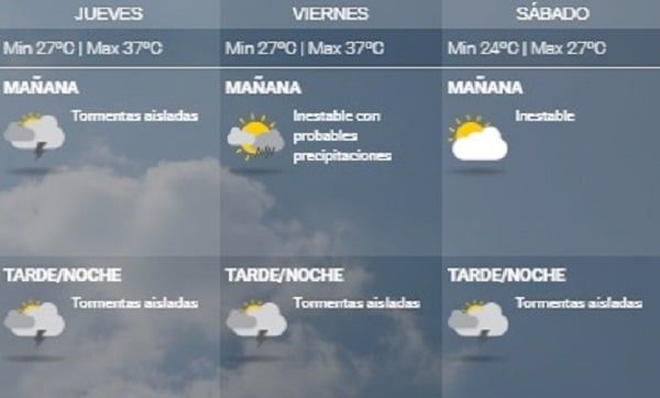 Para la tarde pronostican cielo parcialmente nublado o nublado. Probabilidad de lluvias y tormentas, algunas fuertes. Vientos moderados o regulares del sector norte y una máxima de 37º.