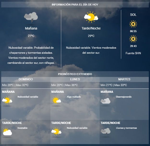 Para hoy, la máxima será de 29º, y la mínima fue de 21º. Para la mañana hay probabilidad de tormentas aisladas, pero el tiempo se compondrá durante la tarde.
