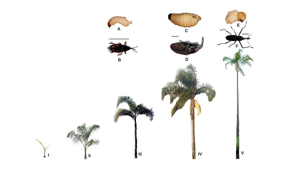 El estudio analizó tres especies de larvas que se crían, con distintos manejos, en cinco estadios de crecimiento del pindó. FOTO: Jorge Justino Araujo.