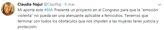 Lo había anunciado en su cuenta de Twitter en una fecha por demás simbólica: el Día de la mujer. En esa jornada, la diputada nacional Claudia Najul presentaba a través de la red social dos proyectos en clara sintonía con el espíritu del #8M.