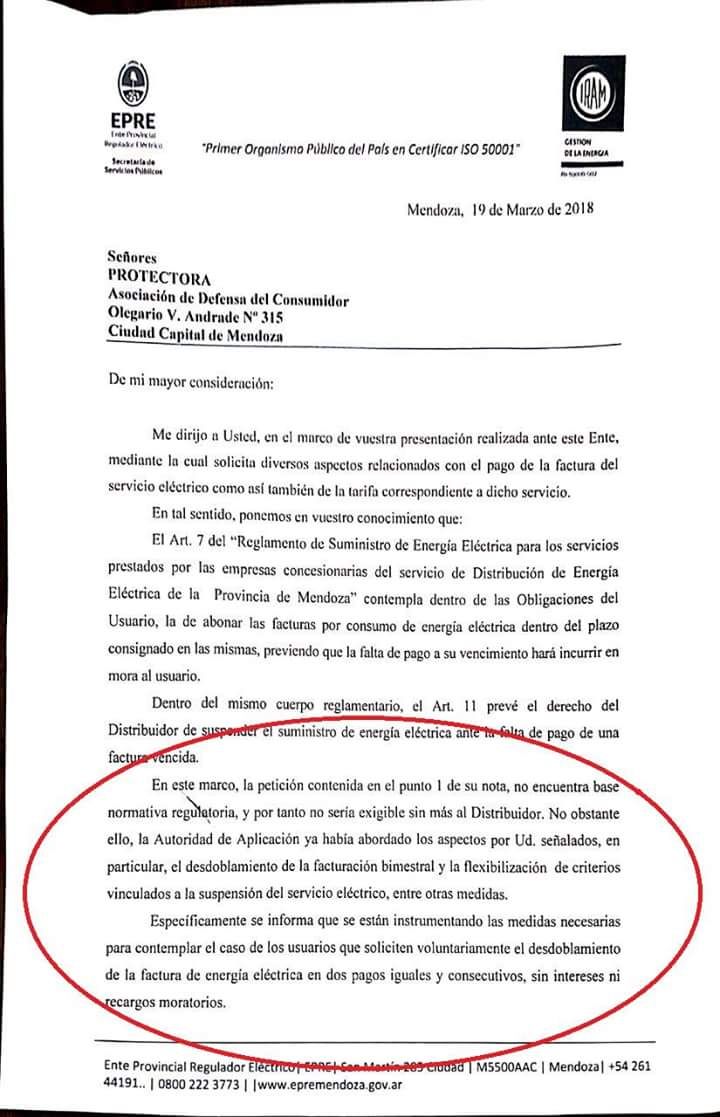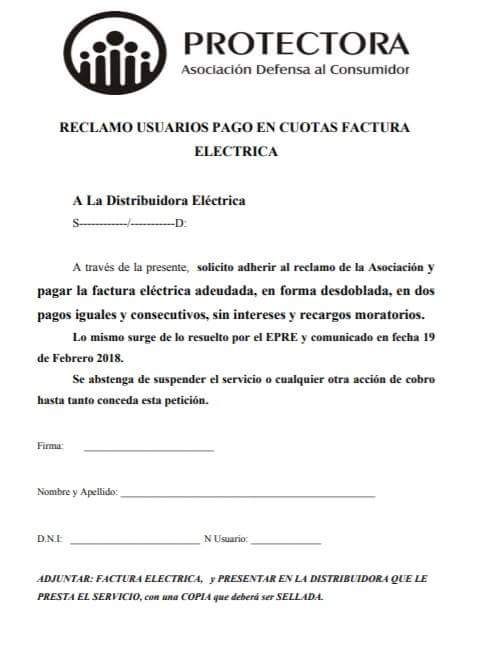 La respuesta del Ente Provincial Regulador Eléctrico (EPRE) a Protectora va en ese sentido. "Específicamente se informa que se están instrumentando las medidas necesarias para contemplar el caso de los usuarios que soliciten voluntariamente el desdoblamiento de la factura de energía eléctrica en dos pagos iguales y consecutivos, sin intereses ni recargos moratorios", dice esa nota.