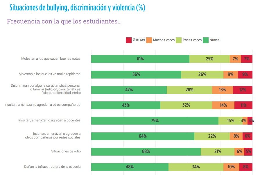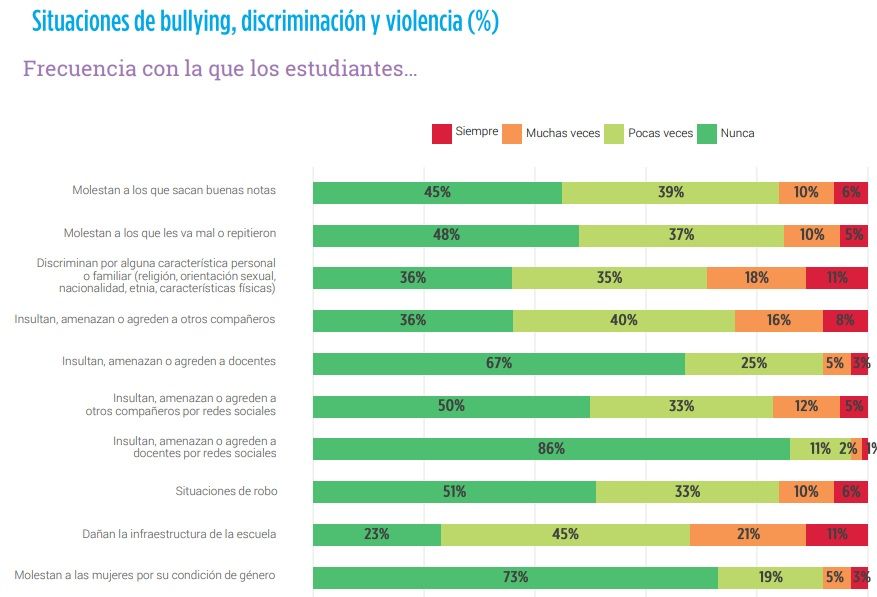 En el examen le preguntaron a los alumnos con qué frecuencia generaron situaciones de bulliying, violencia y discriminación. La respuesta más frecuente apuntó a la violencia contra sus compañeros de aula: 6 de cada 10 niños asegura que agrede a otros alumnos o discrimina por algún rasgo. El otro dato destacado es que la mitad dice haber dañado la infraestructura escolar.