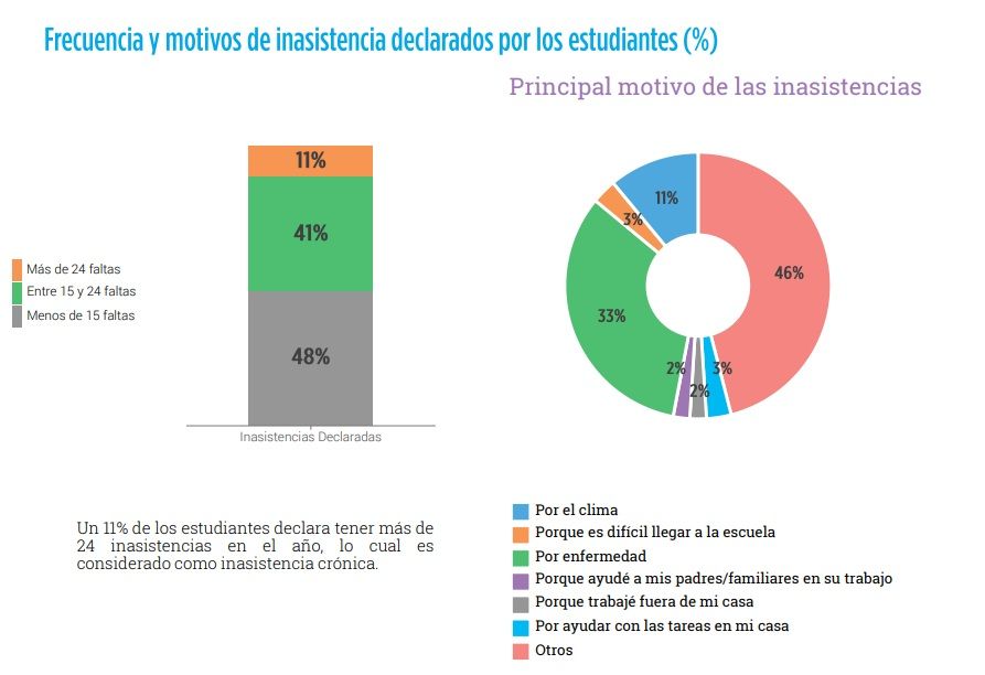 En el secundario uno de los problemas emergentes más preocupantes, fuera de lo académico, es el ausentismo: más de la mitad de los estudiantes falta más de 15 veces al año. Lo más grave es que el 11% del total de alumnos faltó más de 24 veces, es decir estuvo en condiciones de quedar libre por faltas. En ese sentido, los directivos de las escuelas debieron responder preguntas y en más de la mitad de los casos aseguraron que el ausentismo crónico es un problema en la escuela que dirigen.