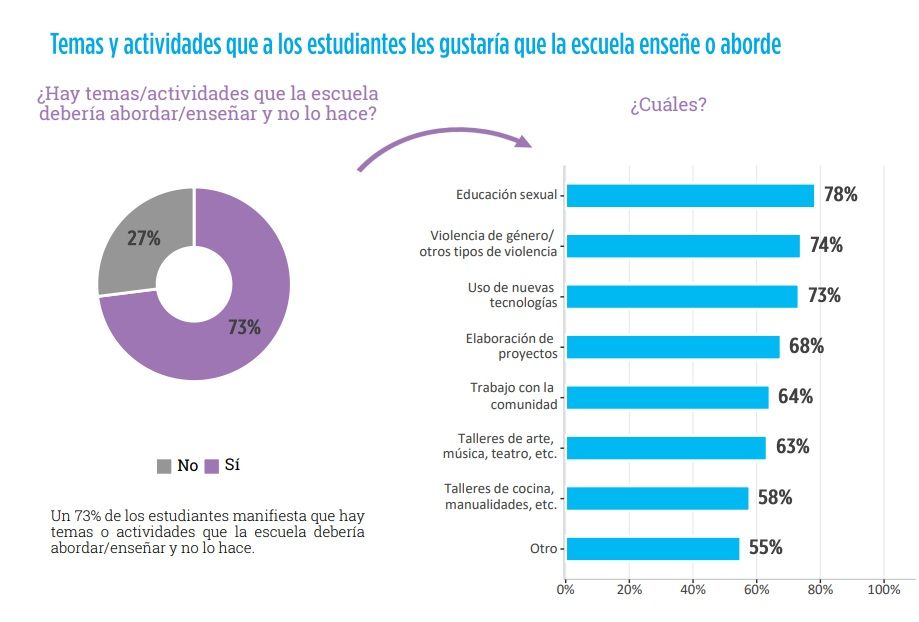 En cuanto a la demanda de parte de los estudiantes, hay casi unanimidad en que es necesario profundizar la educación sexual, sobre todo en el secundario: 8 de cada 10 alumnos lo reclama. Casi al mismo nivel está la demanda de contenidos sobre violencia de género y uso de la tecnología.