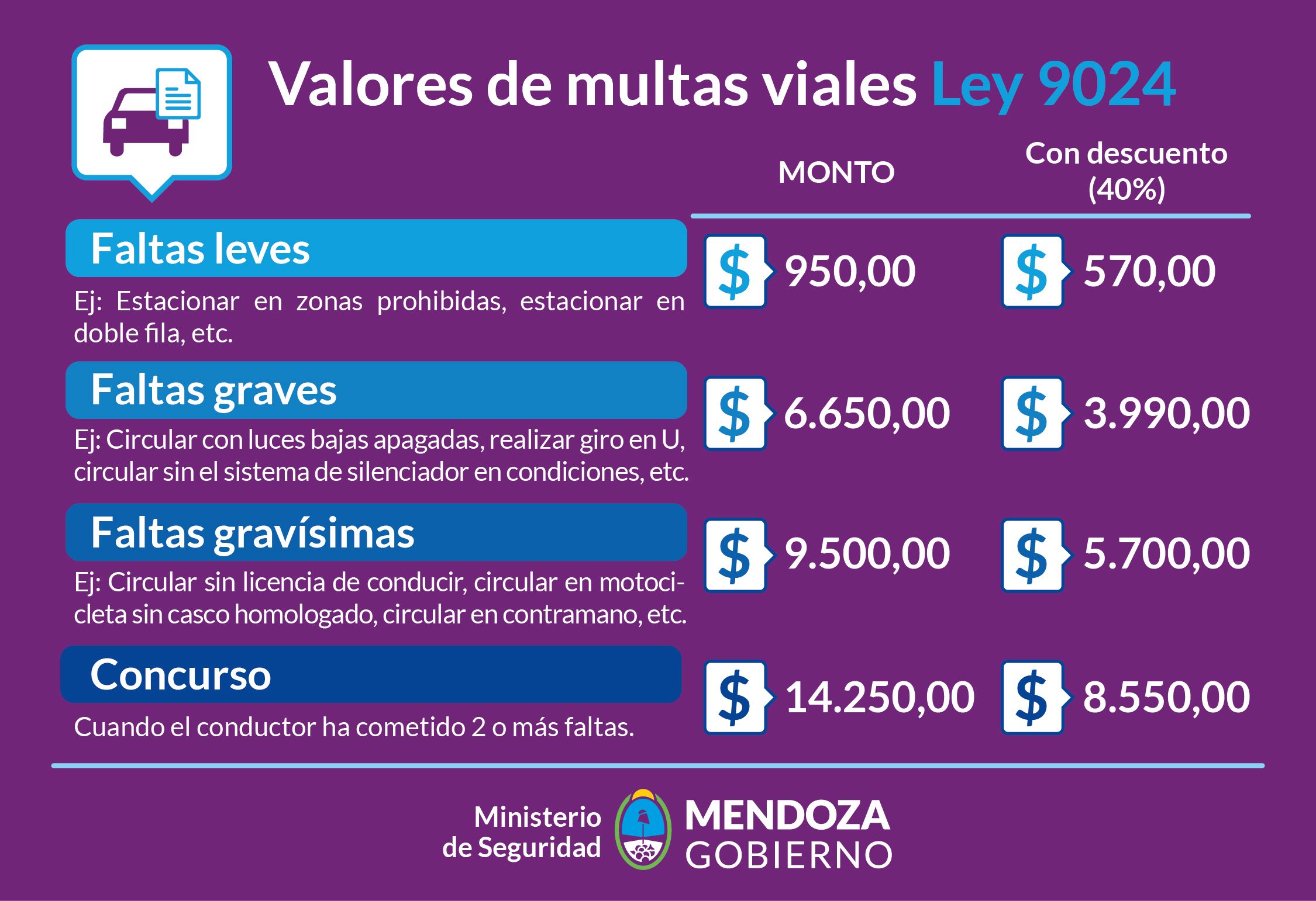 Las multas por faltas leves, como estacionar en doble fila o en zonas prohibidas, tienen un costo de $ 950 y si se aplica el descuento el monto queda en $570. En tanto que las multas por faltas graves rondan los $6.650 y quedan en $3.990 con el descuento. Mientras que las multas por faltas gravísimas le costarán $9.500 al infractor y $5.700 con el descuento.