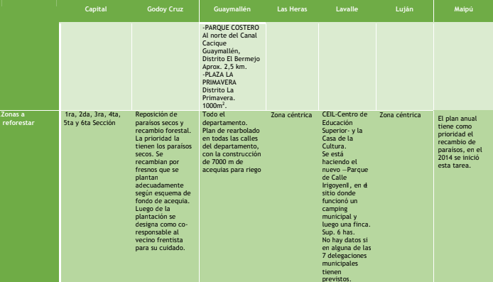 Este plan de "reverdecimiento" no se acotará solamente al Unicipio, advierte Mingorance: "Si el plan de arbolado público aplica al área metropolitana, también aplica a los otros departamentos. Ya hay un plan armado, porque no son los mismos los forestales que hay que plantar en los departamentos urbanos que aquellos que hay plantar en La Paz, Malargüe, o el Valle de Uco. Ambos planes ya están en marcha".