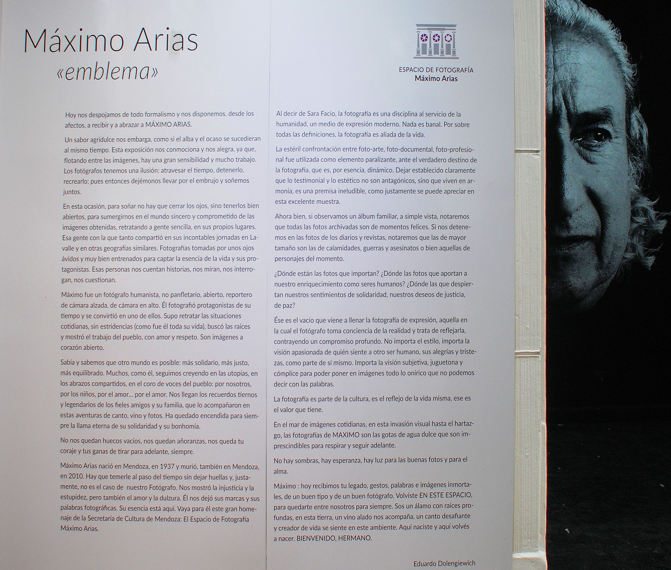 El curador de la muestra, Eduardo Dolengiewich, comentó respecto a su colega: "Máximo fue un fotógrafo humanista, no panfletario, abierto, reportero de cámara alzada, de cámara en alto. Él fotografió protagonistas de su tiempo y se convirtió en uno de ellos. Supo retratar las situaciones cotidianas, sin estridencias (como fue él toda su vida), buscó las raíces y mostró el trabajo del pueblo, con amor y respeto. Son imágenes a corazón abierto".