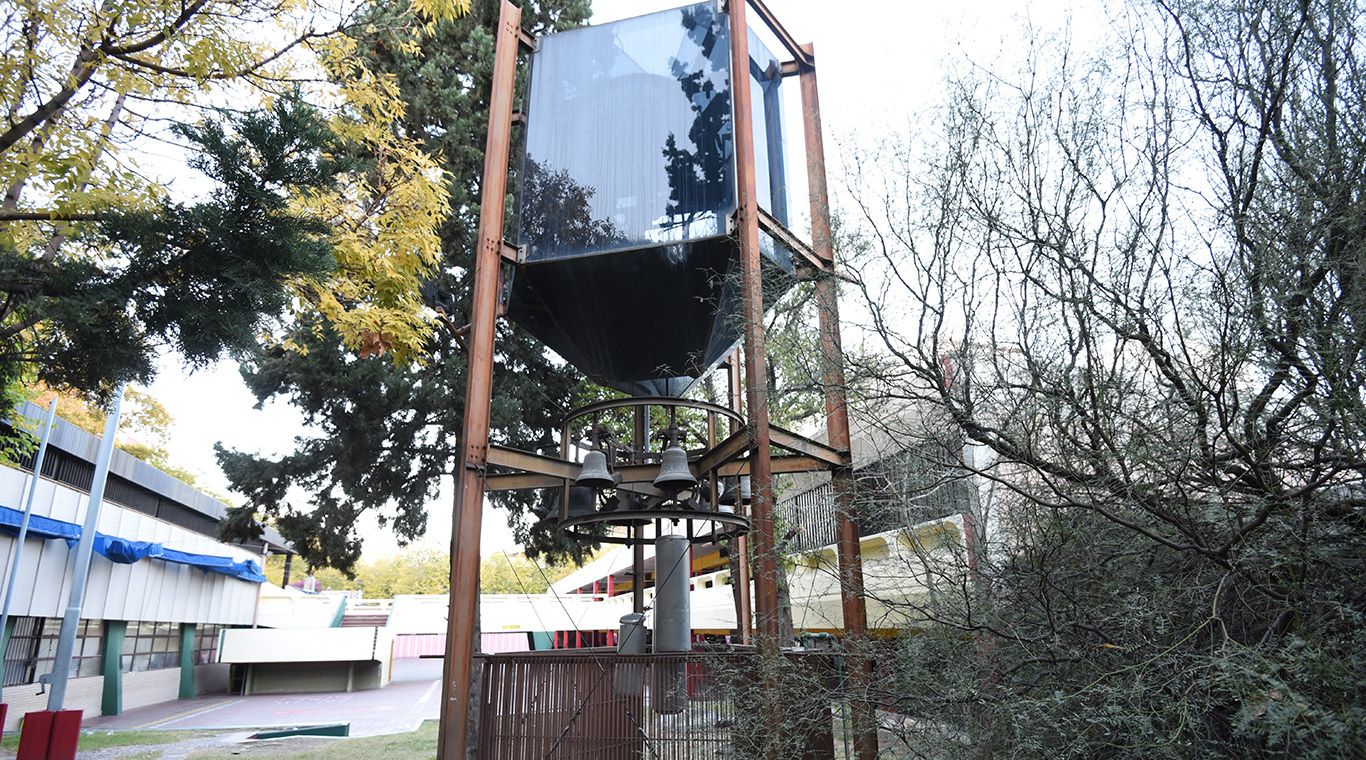 Tras la inauguración del nuevo edificio de la escuela Patricias Mendocinas en diciembre de 1983, el gigantesco reloj fue otra vez montado con sus campanas y su estructura completa en una flamante torre modernista de hierro y vidrio, ubicada en los canteros del patio central; curiosamente, solo sobrevivieron tres de las cuatro circunferencias originales. Aunque sus melodiosas y estruendosas campanas retumbaron unos años más, para inicios de la década de 1990 el reloj guardó silencio definitivo y se convirtió en una pieza inerte pero majestuosa, que aún reposa a la espera de su próximo destino.