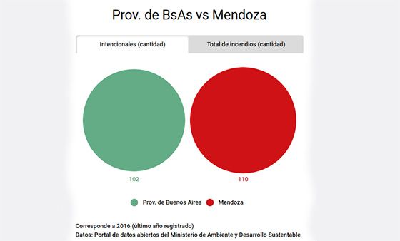Siete de cada 10 incendios forestales registrados en la provincia de Mendoza fueron intencionales o por negligencia, según la información pública brindada por el Ministerio de Ambiente y Desarrollo Sustentable de la Nación.. Y un dato llamativo: si bien en el total de incendios forestales (por causas naturales, desconocidas, o bien intencionales y por negligencia) la relación entre la provincia de Buenos Aires y Mendoza es de 15,9 a 1 (2.802 casos contra 176 en el último año registrado, 2016), al momento de evaluar las causas, en los campos Mendoza hay más casos de incendios intencionales que en la provincia de Buenos Aires: 110 contra 102 (2016), 130 contra 83 (2015) y 108 contra 31 (2014).