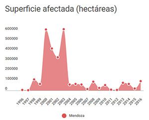 En cuanto al total de incendios forestales, Buenos Aires y Santa Fe (con 2802 y 1241 casos respectivamente) son las provincias del país que registran más casos. Mendoza se encuentra en el lugar 11, por debajo de Jujuy, Catamarca, Chaco, La Rioja, San Juan, Córdoba, Salta, Río Negro, Santa Fe y Buenos Aires.
