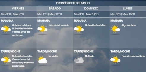 Según el pronóstico del Servicio Meteorológico Nacional para la mañana de este viernes se esperan heladas, neblinas. Nubosidad variable. Vientos leves del sector sur con una mínima de 3º.