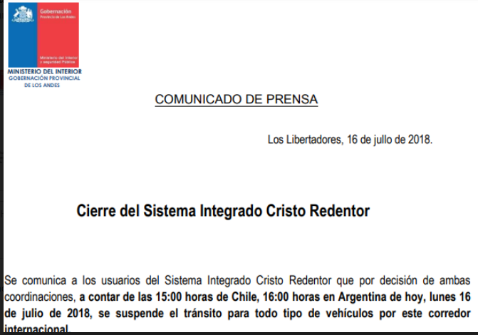 Las inhabilitaciones del cruce internacional se transmiten a través de comunicados oficiales, que se hacen públicos en los medios de comunicación y que se envían a todos los organismos involucrados en el sistema.