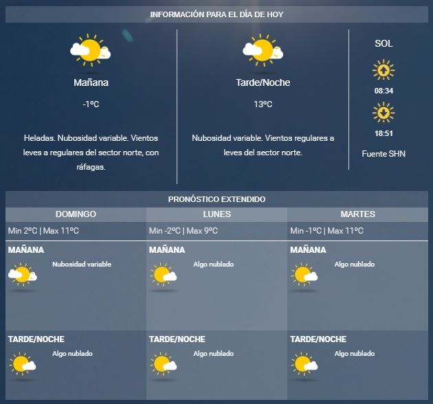 Para hoy, la mínima en el Gran Mendoza fue de casi -2º, y la máxima será de 13º durante la tarde. Rige además un alerta por vientos intensos en la cordillera, que en Mendoza se sentirán por encima de los 4.000 metros.
