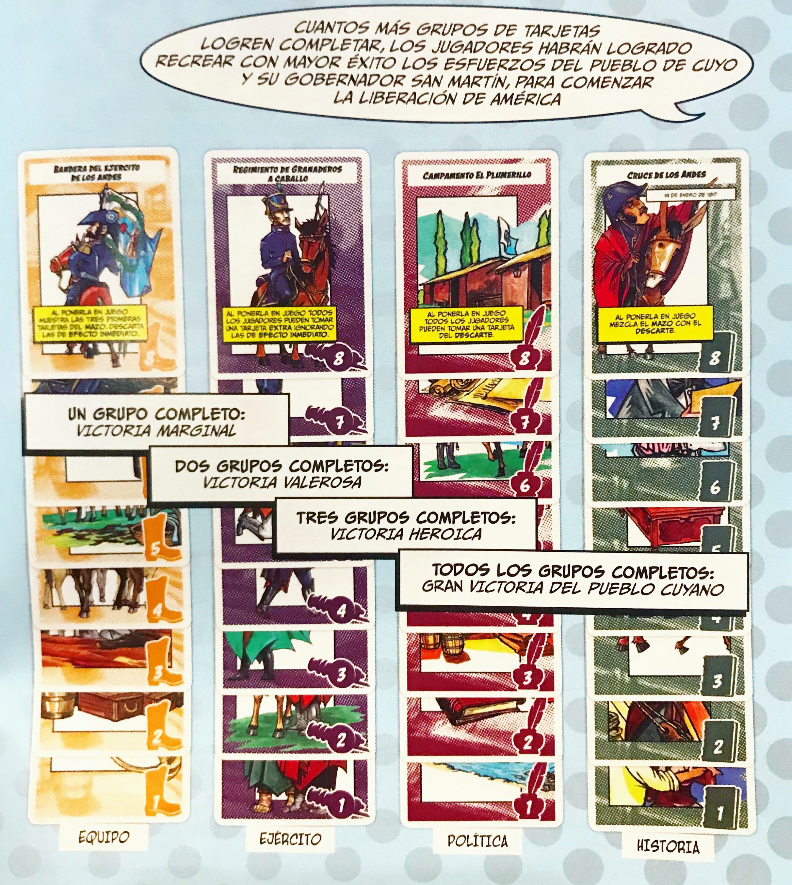 Los grupos de tarjetas se dividen en Equipo, Ejército, Política e Historia. Cada uno de estos grupos cuenta con 8 tarjetas, las cuales están enumeradas con el objetivo de que los integrantes del juego, a medida que las consiguen, vayan colocándolas según su numeración en forma de "escalera".
