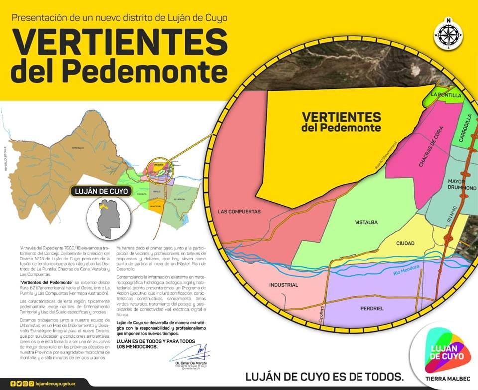 Con el conflicto territorial con Las Heras ya resuelto, Luján de Cuyo avanza en la creación de un nuevo distrito. Se trata de Vertientes del Pedemonte, emplazado junto a Las Compuertas, Vistalba, Chacras de Coria y La Puntilla.