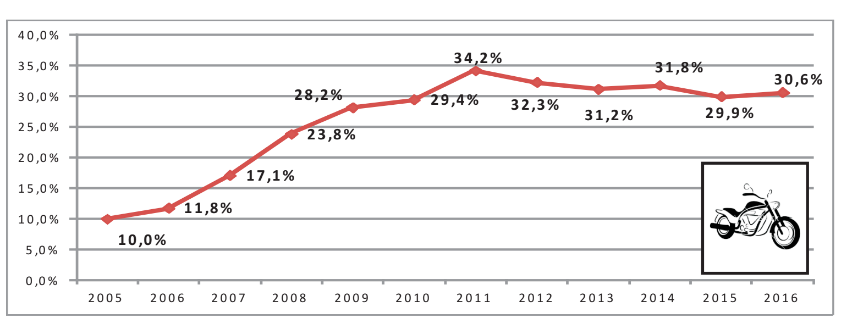 Este crecimiento ha ido acompañado de una fuerte suba de siniestros. Hasta el 2005 la participación de la moto en la siniestralidad vial grave era del 10% del total (de cada 10 vehículos partícipes en siniestros solo 1 era una moto). Diez años después, esa participación se triplicó y en el 2016 trepó al 30.6%.