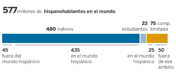 Según datos del Instituto Cervantes, la cifra actual de hispanoparlantes asciende a 577.246.327. Esto representa el 7,6% de la población mundial. El caso de Estados Unidos es sintomático: el 17,8% de la población es hispana, según un estudio de 2016. Hoy son 40 millones de hablantes, pero la expectativa es que en una década superarán a la comunidad nativa española.