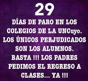 El paro que afecta a los colegios secundarios de la UNCuyo ha llegado a tal límite que el Grupo de Padres Autoconvocados exigió la vuelta a clases, 180 días de cursado presencial y la finalización del programa de estudios 2018 con evaluaciones programadas.