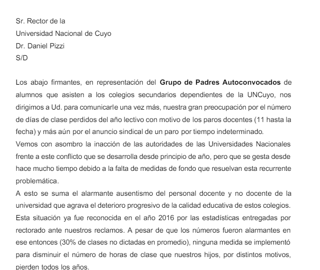 En el texto enviado le planteron a Pizzi: "Le solicitamos una vez más como padres y como contribuyentes que mantenemos el sistema educativo público, que implemente en forma urgente las medidas que sean necesarias para garantizar la presencia de docentes y alumnos en las aulas. Además le pedimos que siendo usted el máximo responsable de la Universidad nos asegure una respuesta institucional en tiempo y forma a esta nota".