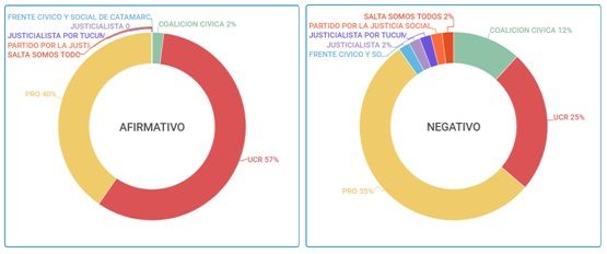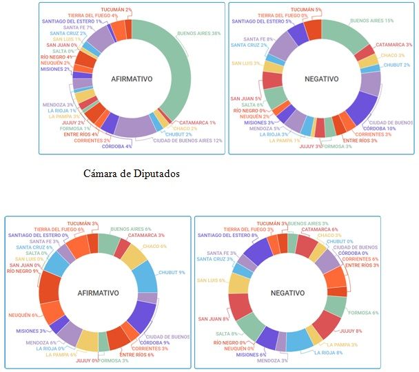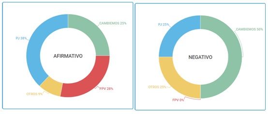 Se ve, entonces, que Cambiemos es determinante a la hora del rechazo de la media sanción, puesto que el 50% del voto negativo se constituye de votos oficialistas, veamos entonces qué ocurre al interior del bloque de la primera minoría en cada una de las cámaras legislativas.