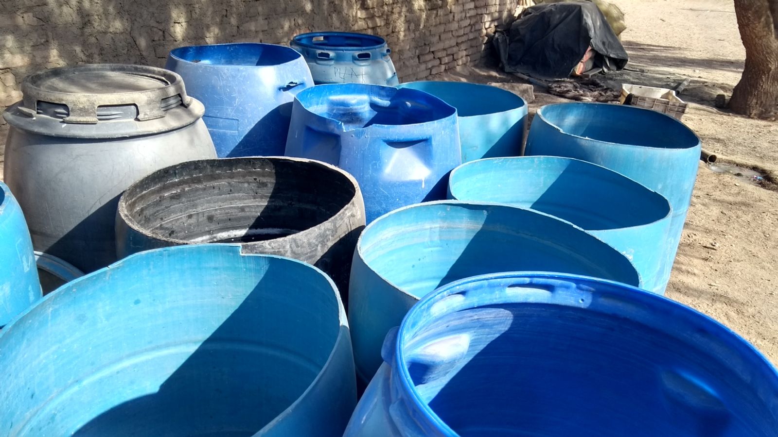 Las puertas de las casas tienen algo en común. Hay decenas de tachos azules donde acumulan agua. “Nos traen el agua una vez por semana. Nunca se va a solucionar, creo, el problema del agua. El agua de las fincas dicen que está contaminada, y acá no pasa nada”, explica. Algo de razón tiene. No hay forma de urbanizar el lugar porque por el subsuelo cruza el petróleo que se transporta a la refinería. Por eso se acostumbran a los tachos azules. En realidad, si se hiciera una radiografía del suelo, los ductos petroleros que van hacia el polo industria, y los que salen desde allí quedarían reflejados como huesos en la tierra.