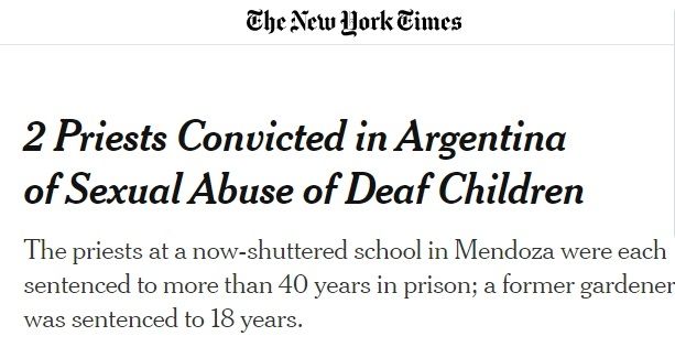 En EEUU, el prestigioso diario NY Times destacó que "2 curas condenados en Argentina de abuso sexual de chicos sordos". "Los curas de la ahora cerrada escuela en Mendoza fueron sentenciados a más de 40 años en prisión", indicó el diario más grande del mundo.