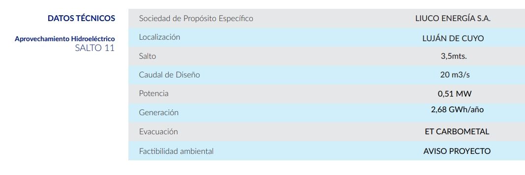 El PAH (Pequeños Aprovechamientos Hidroeléctricos) Salto 11 fue concebido con un diseño compacto, en una única estructura que aloja la compuerta de aducción y dos turbinas tornillo. Los tornillos, de 4 metros de diámetro y 12 de largo, llegaron a Mendoza desde Polonia, y armarlos es una tarea de ingeniería compleja que ya está en marcha. Se llaman “tornillos de Arquímedes” y son parte de la presa, que además tiene un “pico de pato” que sirve para elevar el nivel del agua. Una vez que los enormes tornillos estén montados, se culminará la obra, que inyectará al sistema eléctrico interconectado 0,52 MW