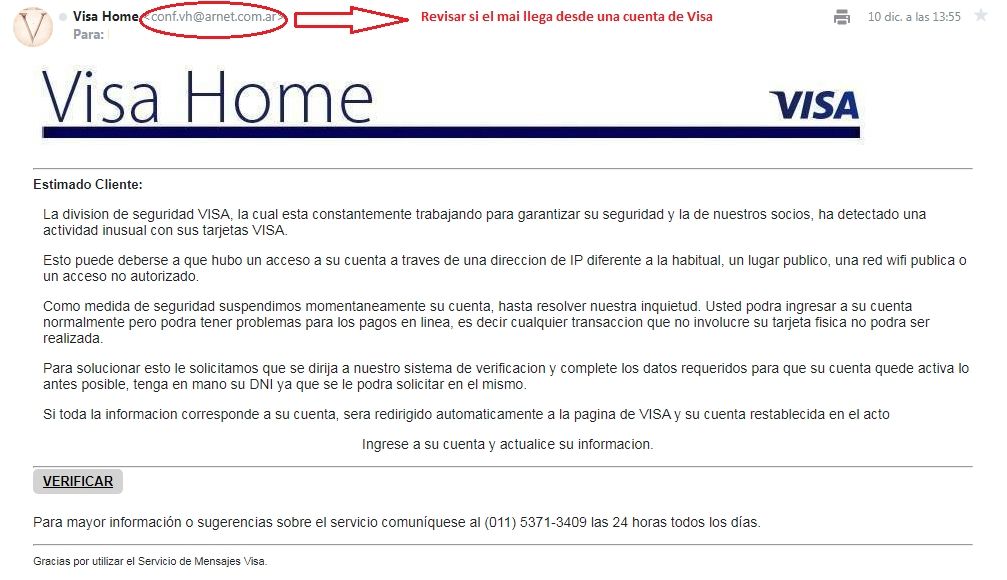 A simple vista, el remitente indica que el correo fue enviado por Visa Home y en el asunto anuncia "Su cuenta fue bloqueada". El objetivo es que el usuario se alarme e ingrese para ver qué sucedió. Al entrar al mail se puede ver el logo de Visa y un correo prolijamente redactado en el que se informa al usuario que Visa ha detectado una actividad inusual en las tarjetas de crédito. Por eso, invita al destinatario a hacer click en un botón para verificar los datos de su tarjeta de crédito.
