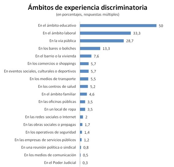 - Los lugares más recurrentes en cuanto a la discriminación: 50 de cada 100 encuestadas/os asegura haber vivido o presenciado situaciones de discriminación en el ámbito educativo. En segundo orden figura el ámbito laboral, en tercero la vía pública, en cuarto lugar bares o boliches y en quinto el barrio o vivienda.