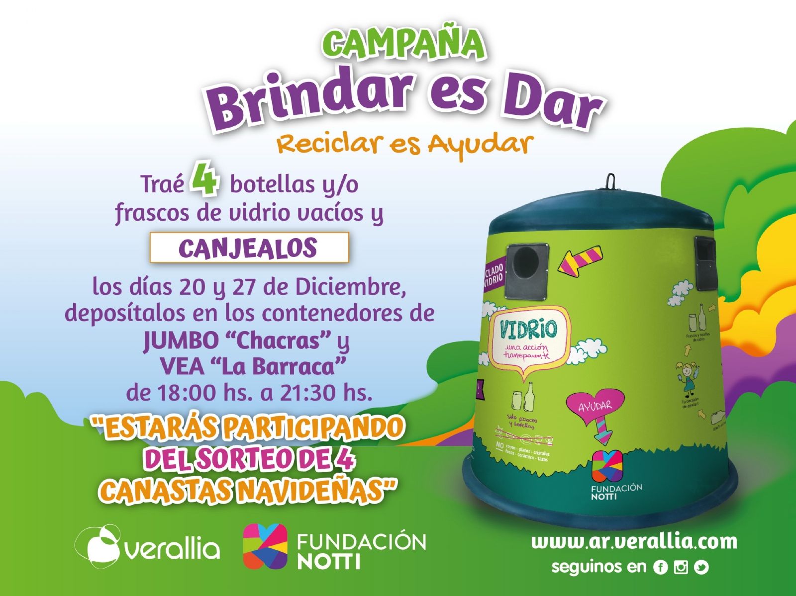 La entrega de cupones se hará los días 20 y 27 de diciembre de 18:00 a 21.30 horas en Jumbo Chacras de Coria y VEA de la Barraca Mall. Los sorteos en ambos puntos se realizarán el viernes 27 de diciembre a las 21.30 horas. La acción consiste en llevar botellas y/o frascos de vidrio vacíos y depositarlos en los contenedores ubicados en ambos puntos de reciclado. En esos días, se les entregará 1 cupón por cada 4 envases de vidrio que lleven para reciclar. Mediante el llenado de estos cupones podrán participar por 4 canastas navideñas para las fiestas de fin de año, dos en cada uno de los puntos.ç