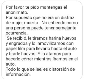 Sin embargo, en las últimas horas los amigos de Vidal salieron a defenderlo y a desmentir que el joven se haya disfrazado de "víctima de femicidio". "Tomás está a favor de la legalización del aborto y por eso lo jodíamos con eso y le pusimos el pañuelo verde y la frase. No se disfrazó de mujer muerta. Lo envolvimos con papel film para que no se moviera mientras le tirábamos huevos y le pusimos la soga para que corriera al costado del auto", justificó un amigo del joven, quien pidió mantener el anonimato por la gran repercusión que tuvo lo ocurrido.