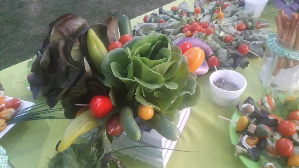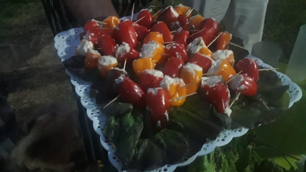 Se sirvieron pimientos y tomates cherrys rellenos de una preparación a base de trucha; mezcla de quesos envueltos en hojas tiernas de lechuga; berenjenas rellenas con salsas suaves elaboradas con aceite de oliva de la zona; pinchos coloridos mezclando productos de la huerta.