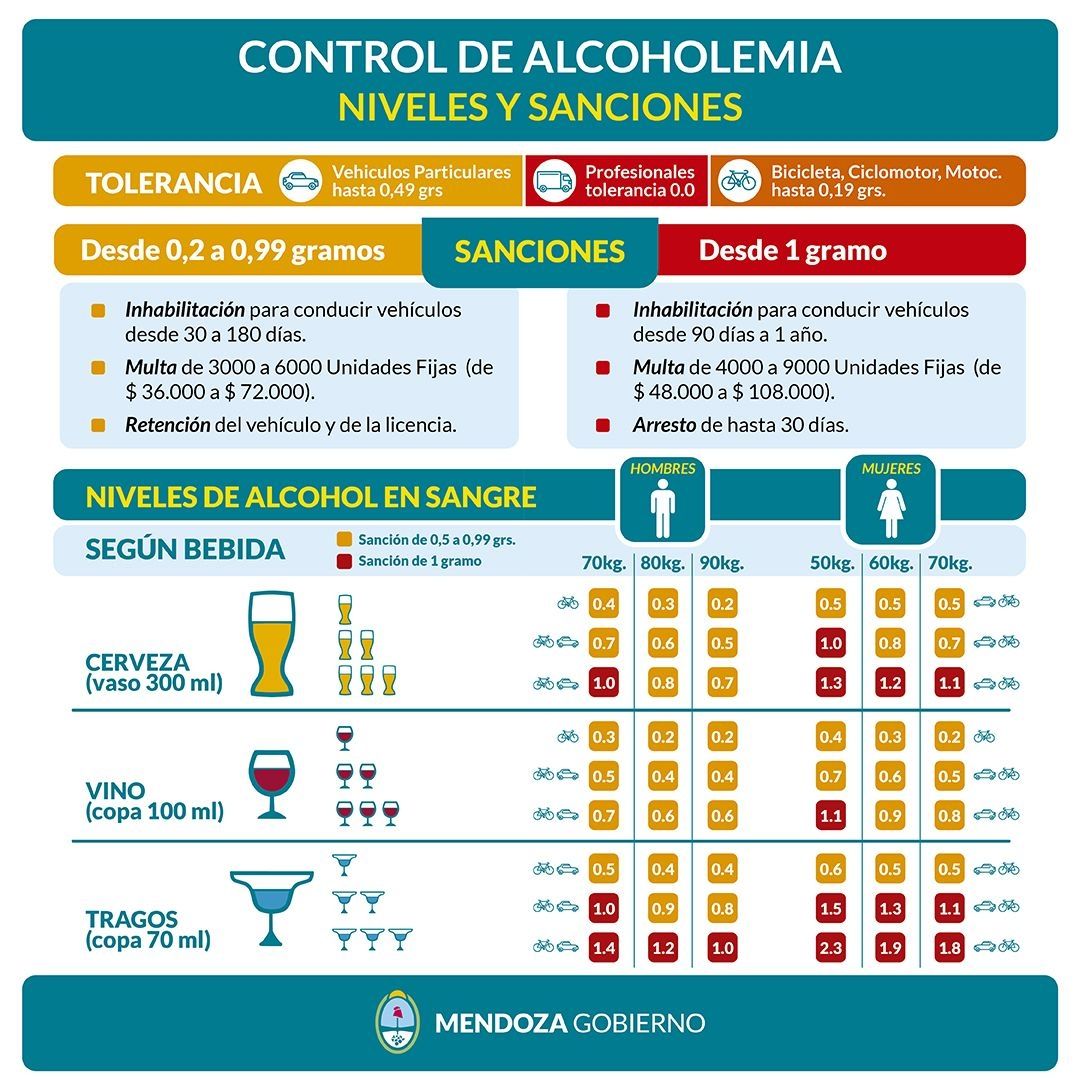 Cabe recordar que quienes manejen automóviles no pueden hacerlo con más de 500 miligramos de alcohol por litro en sangre, quienes lo hagan en bicicleta o moto con más de 200 miligramos y aquellos que conducen vehículos para el transporte de pasajeros o de carga deben hacerlo con cero miligramos.