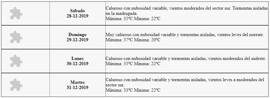 En tanto que, el domingo, estará "muy caluroso con nubosidad variable y tormentas aisladas, vientos leves del noreste".