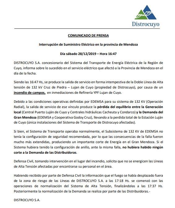 La empresa Distrocuyo SA, concesionaria del sistema del transporte de energía eléctrica de la región de Cuyo, informó en un comunicado emitido hoy sobre lo sucedido en el servicio eléctrico que afectó a la provincia este sábado por la tarde.