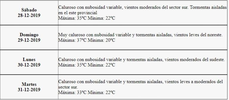 "Muy caluroso con nubosidad variable y tormentas aisladas, vientos leves del noreste", indica el pronóstico.