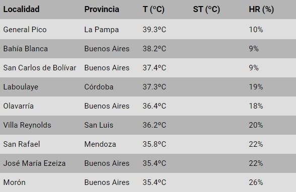 La lista la encabezaba General Pico de La Pampa, en donde se registraron 39,3º. Segunda estaba Bahía Blanca, con 38,2º, y tercera San Carlos de Bolívar con 37,4º.
