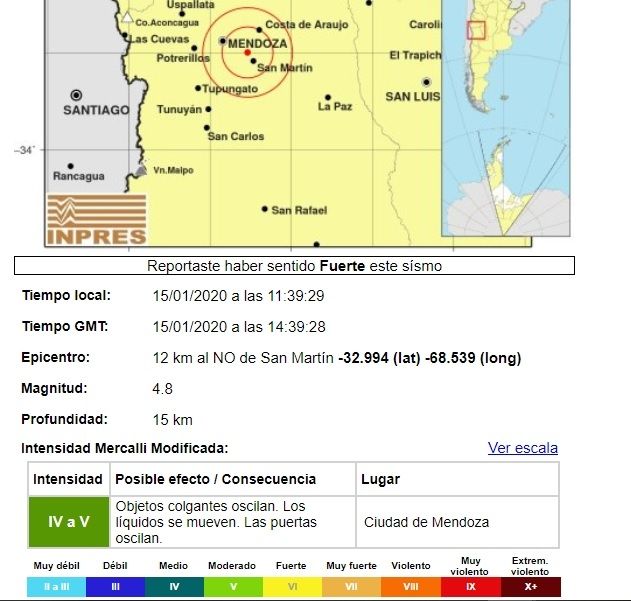 El sismo que sacudió Mendoza fue superficial y cerca de varios centros urbanos, como el Gran Mendoza y San Martín. El Instituto Nacional de Prevención Sísmica precisó los datos y bajó la magnitud del sismo: fue de 4.8, a una profundidad de 15 kilómetros.