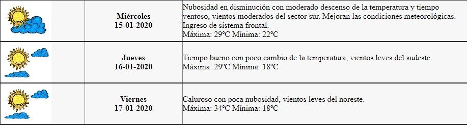 "Nubosidad en disminución con moderado descenso de la temperatura y tiempo ventoso, vientos moderados del sector sur. Ingreso de sistema frontal. Máxima 29ºC y Mínima: 22ºC", es lo que reza la estimación del organismo provincial.