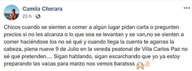 Además, añadió: "Plena 9 de Julio en la vereda peatonal de Villa Carlos Paz, no sé qué pretenden. Sigan hablando, sigan escrachando que yo ya estoy preparando las vacas para marzo. Nos vemos barats", haciendo referencia al término que usa Alex Caniggia.