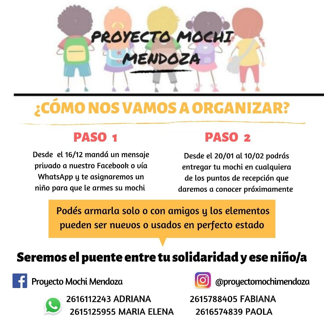 Proyecto Mochi Mendoza surgió de la mano de un grupo de docentes quienes preocupadas por los índices de pobreza decidieron hacer una convocatoria para poder ayudar. “Una mochi es algo que se les puede dar a los chicos a futuro, un estudio, algo de lo que nadie se pueda apropiar”, cuenta Adriana Infanti creadora del proyecto y voluntaria.