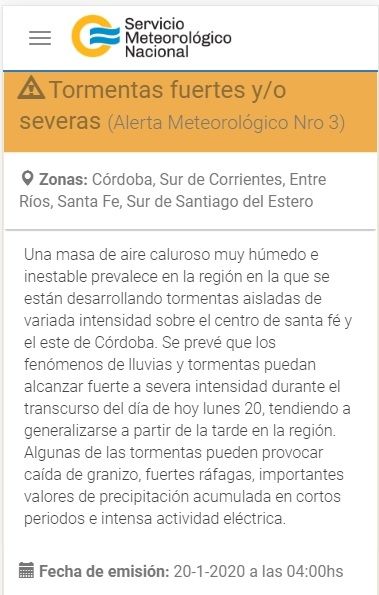 Según se remarca en el texto de la advertencia, es posible que esta tarde "desarrollen áreas de lluvias y tormentas en la zona de cobertura correspondiente a Mendoza, norte de Río Negro, La Pampa, San Juan, La Rioja y el sur de la provincia de Buenos Aires, las cuales luego afectarán también a San Luis y al oeste de la provincia de Buenos Aires".