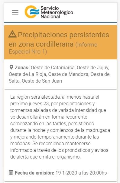 El otro alerta salió a las 20, y es por "Precipitaciones persistentes en zona cordillerana". El informe rige para la zona montañosa de Catamarca, Jujuy, La Rioja, Mendoza, Salta y San Juan. El texto destaca que "la región será afectada, al menos hasta el próximo jueves 23, por precipitaciones y tormentas aisladas de variada intensidad que se desarrollarán en forma recurrente comenzando en las tardes, persistiendo durante la noche y comienzos de la madrugada y mejorando temporariamente durante las mañanas".