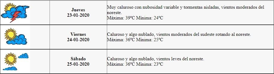 El pronóstico de la Dirección de Contingencias Climáticas indica para hoy: "Muy caluroso con nubosidad variable y tormentas aisladas, vientos moderados del noreste. Máxima 39ºC, Mínima 24ºC".